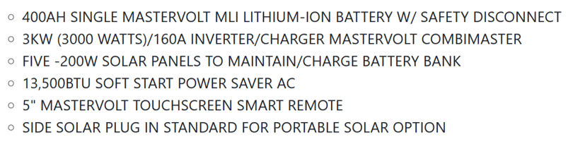 Lucky for us we were able to find our dream RV at a local dealer. After touring the model on the lot and discussing our exact needs with our amazing sales associate we were delighted to learn that the Power Package was an option for our RV that checked all of the boxes we had. This was it. Off grid power installed at the factory. Sold. This is what was included.