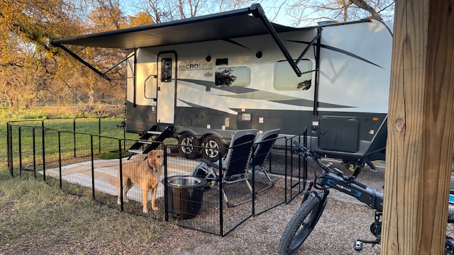 • 1. We have a beautiful 83lb Golden Retriever named Teddy, so the first thing be bought was a fencing system to give him a play yard at each campsite. We chose this OFIKA Heavy Duty Metal Dog Playpen system because of the number of panels giving us many configuration options to choose from. Not only does this set come in two different heights (2ft tall to go along the body of the RV, and 40″ tall for the outside perimeter), it’s super easy to assemble and has multiple entrances to position where you would like.